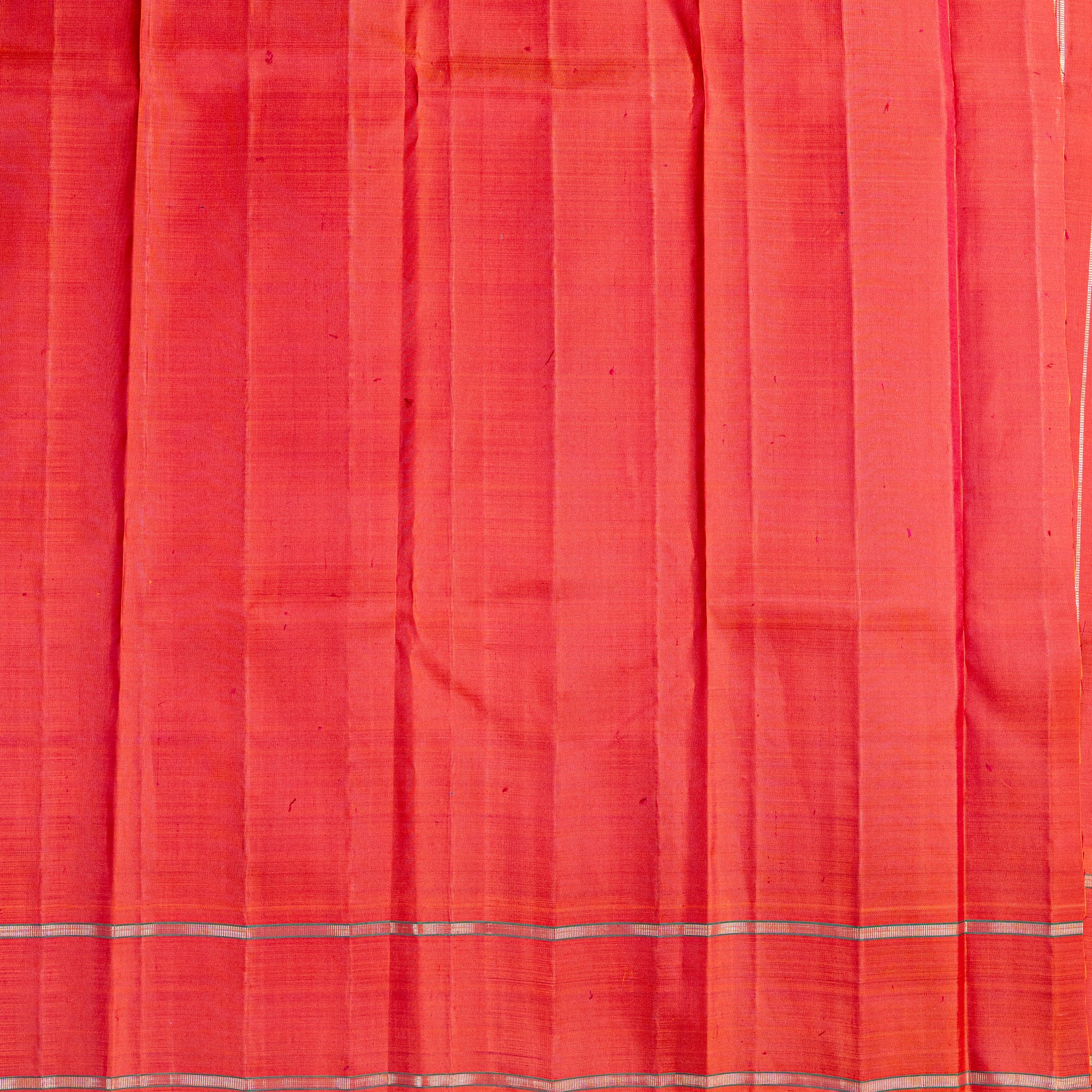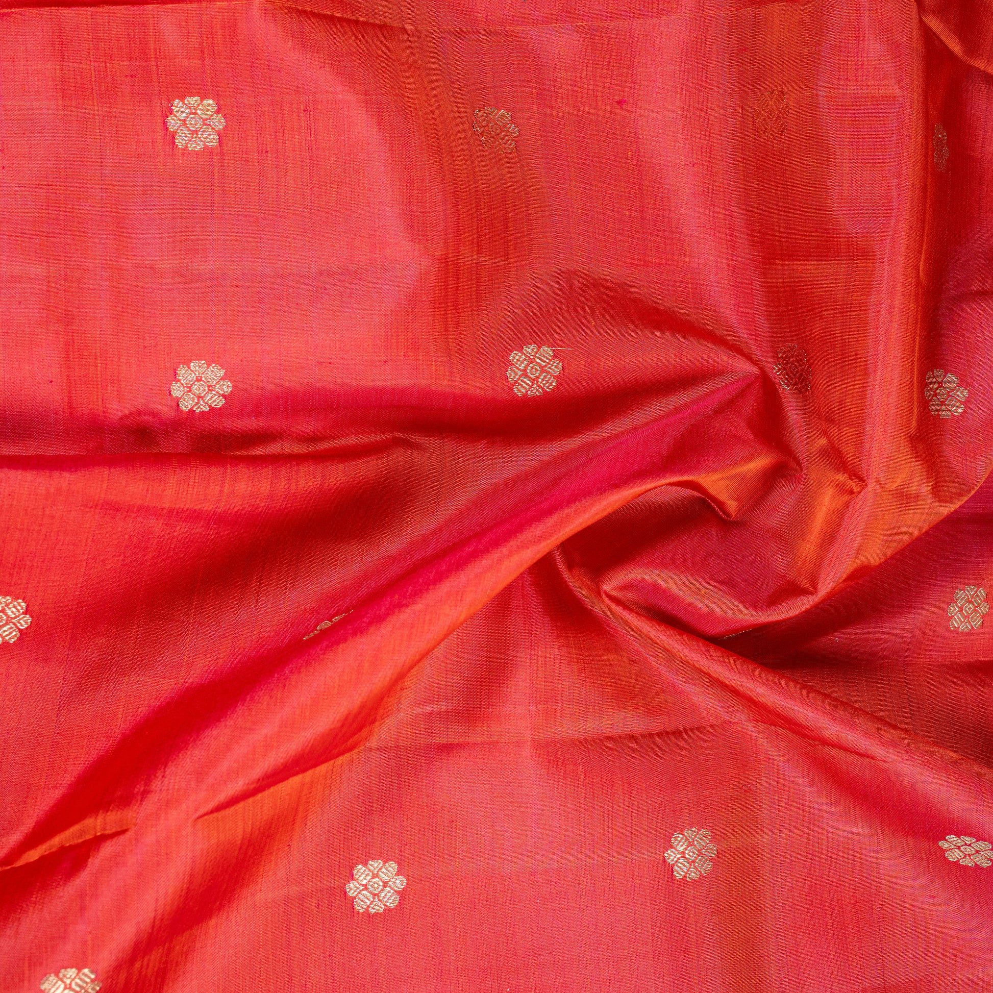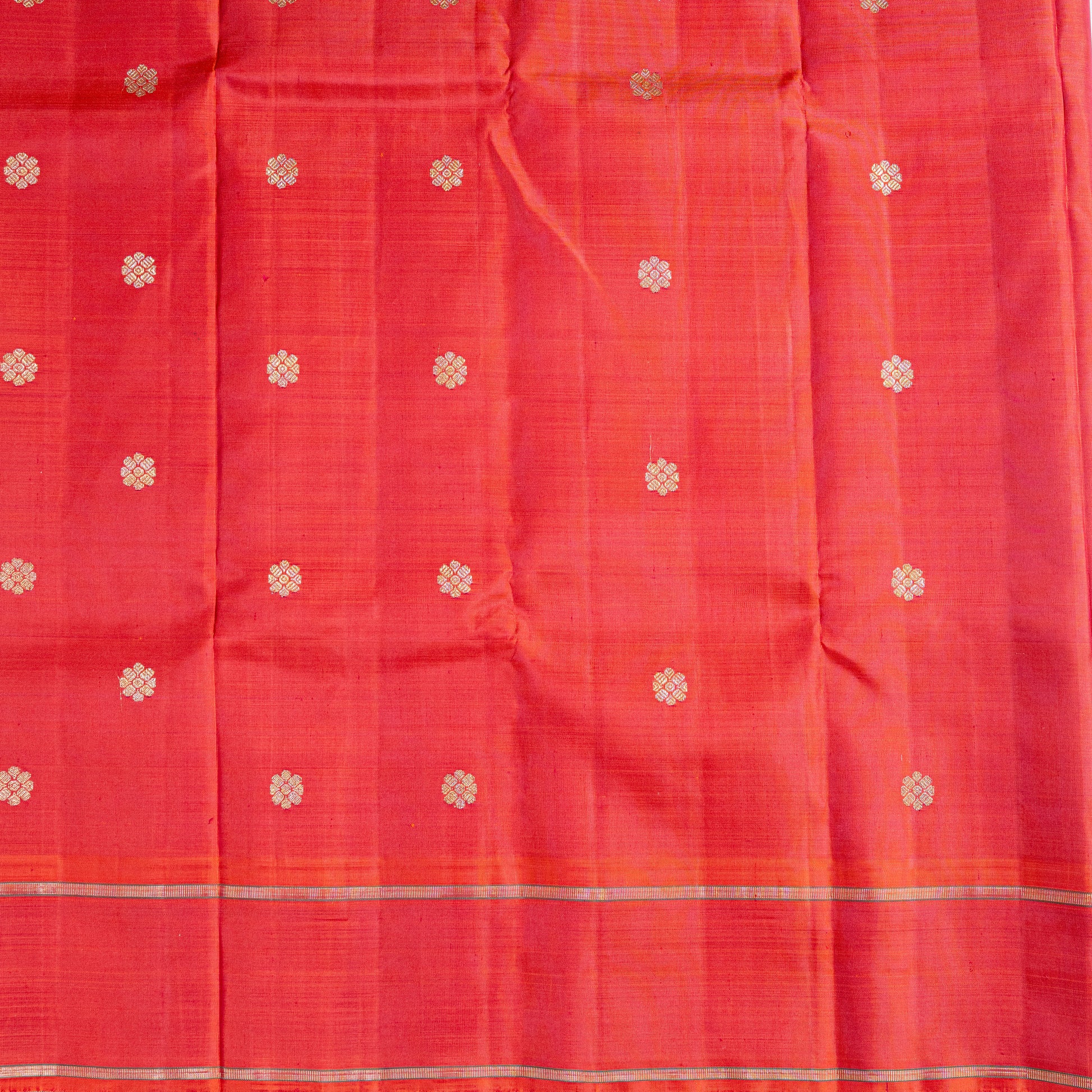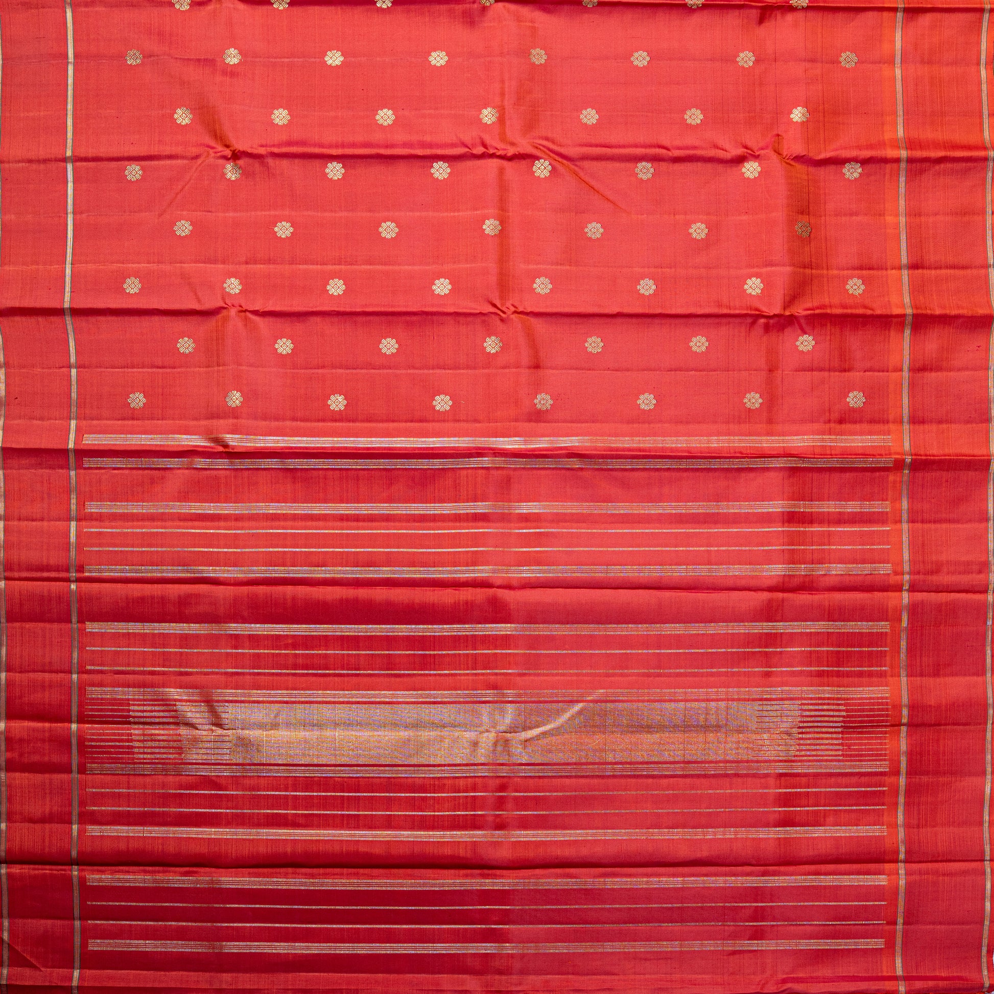 An elegant pure silk saree in a bright tomato red (or vermillion) shade. The body is adorned with delicate, scattered gold zari buttas (small floral motifs). The saree features a striking pallu (end piece) with rich horizontal gold zari stripes and bands of fine zari work. The borders are subtle, defined by neat vertical zari lines. This radiant saree is a classic choice, perfect for festive occasions, pujas, and traditional ceremonies.