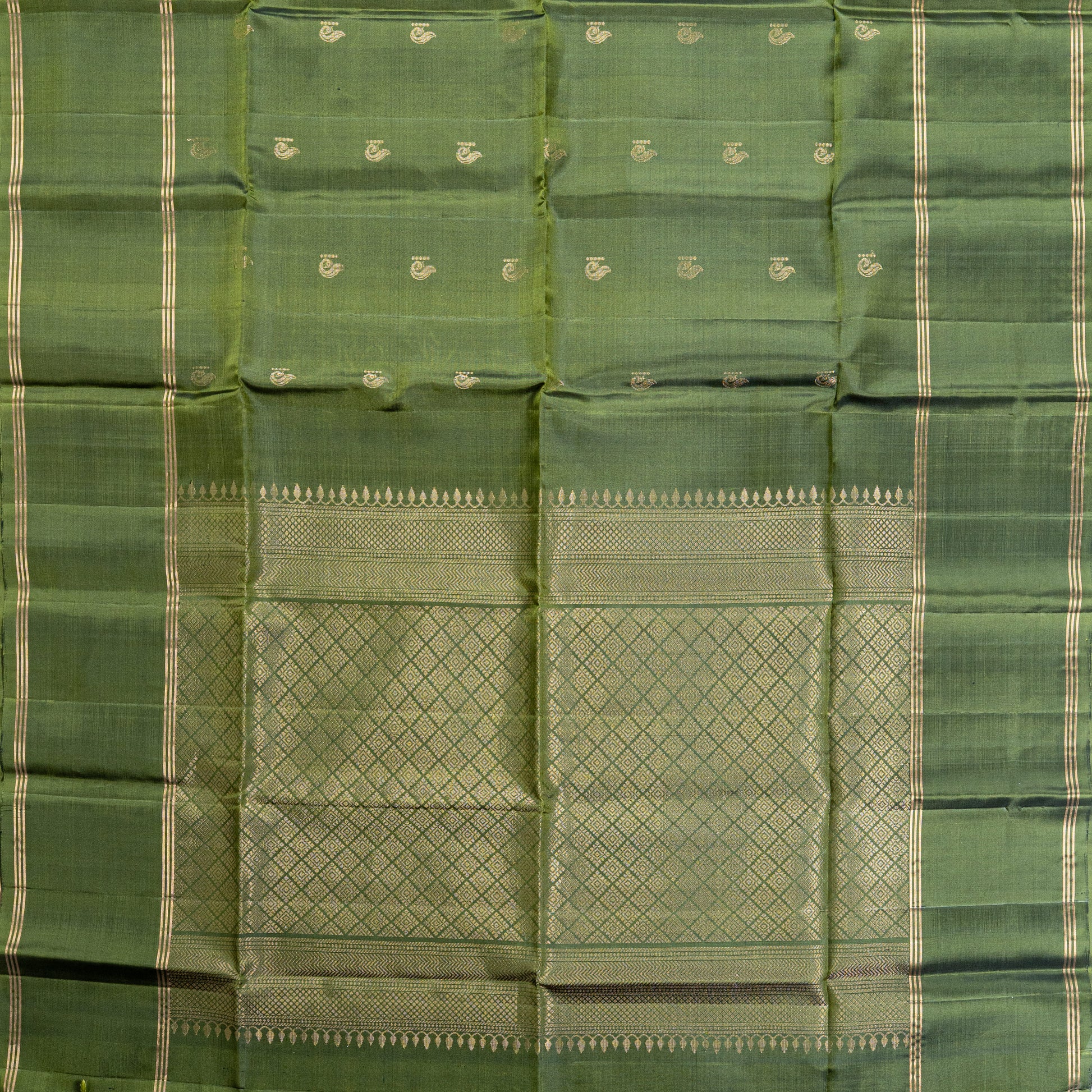 A sophisticated pure soft silk saree in a rich forest green color. The body is subtly adorned with delicate, small woven zari motifs (likely peacock or similar traditional designs). The striking feature is the expansive gold zari pallu (end piece), which features an intricate diamond grid pattern framed by classic temple borders. The pallu and borders are accented with thin zari lines, offering an elegant and timeless look perfect for formal occasions.