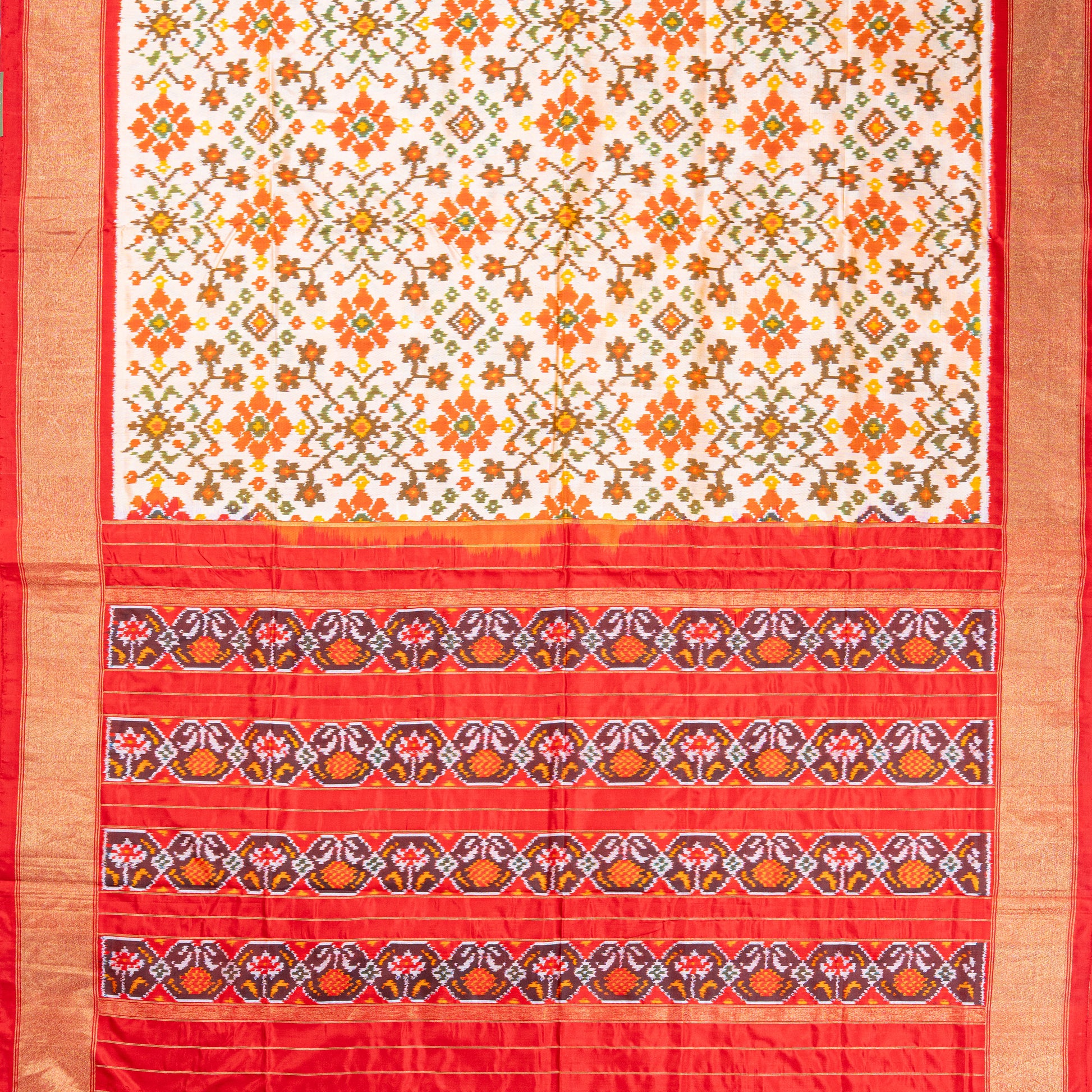 Elegant White & Red Silk Saree with Geometric Ikat and Zari