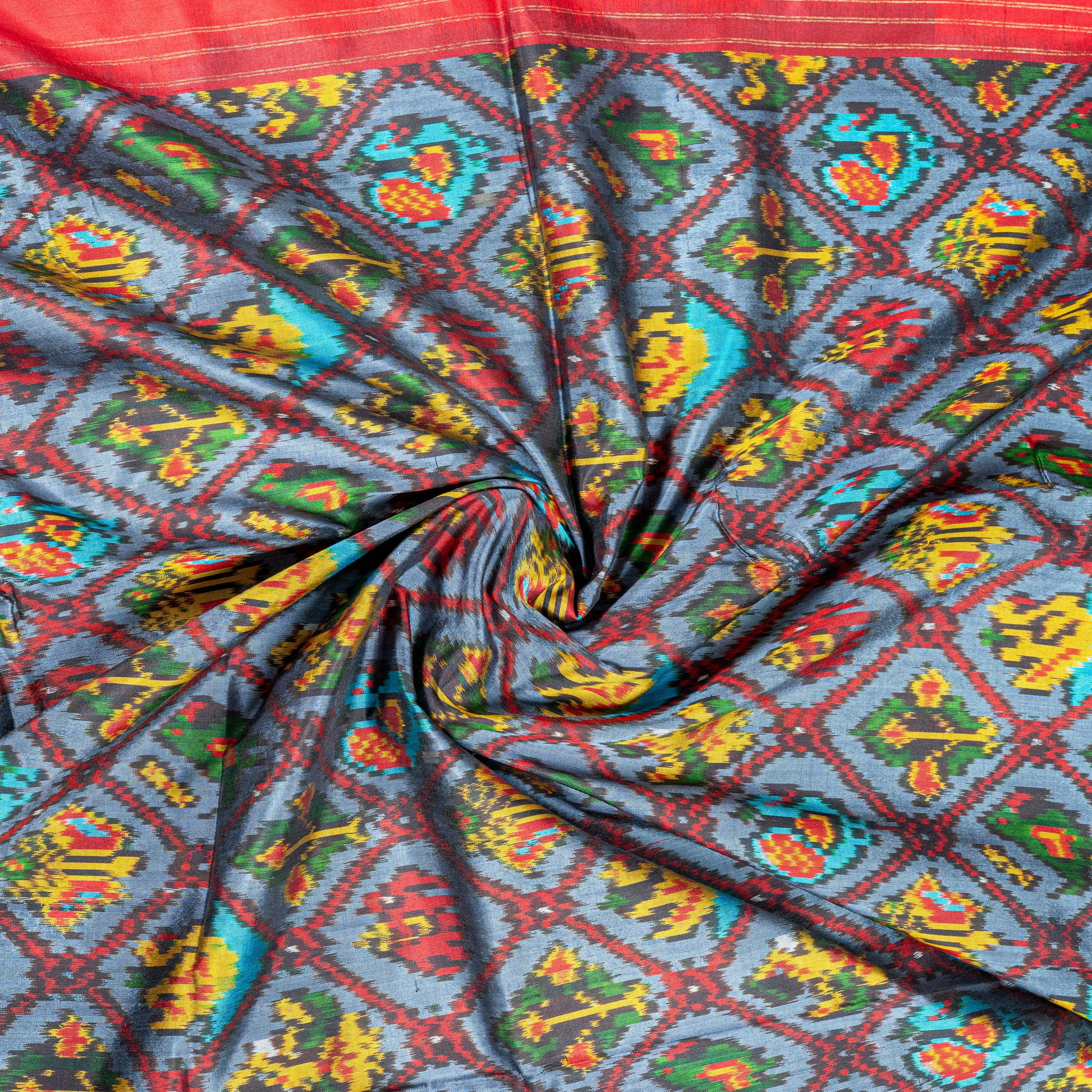 Handwoven Pochampally Ikat Silk Saree featuring a vibrant Blue body with geometric motifs, a contrasting Red pallu with multicolor elephant designs, and a rich gold zari border. Perfect for festive and special occasions.