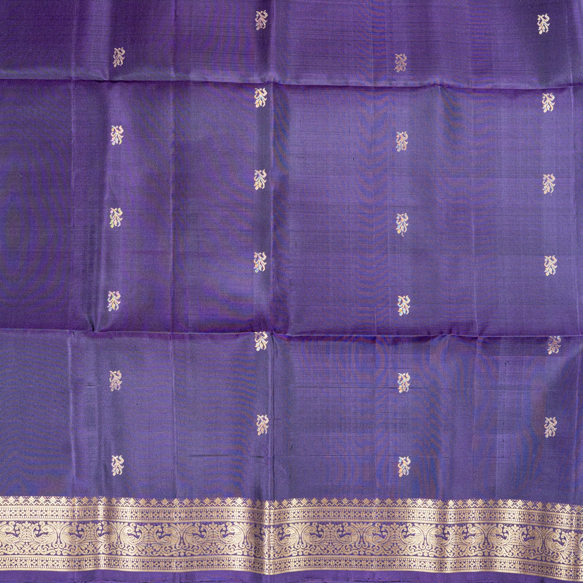 An opulent pure soft silk saree in a rich, jewel-toned deep purple (or aubergine/violet). The body is elegantly scattered with small, traditional antique gold zari buttas (motifs). The saree is highlighted by a sophisticated border and pallu featuring intricate paisley and floral zari work, giving it a regal and timeless appearance. Perfect for evening wear, weddings, and grand celebrations.