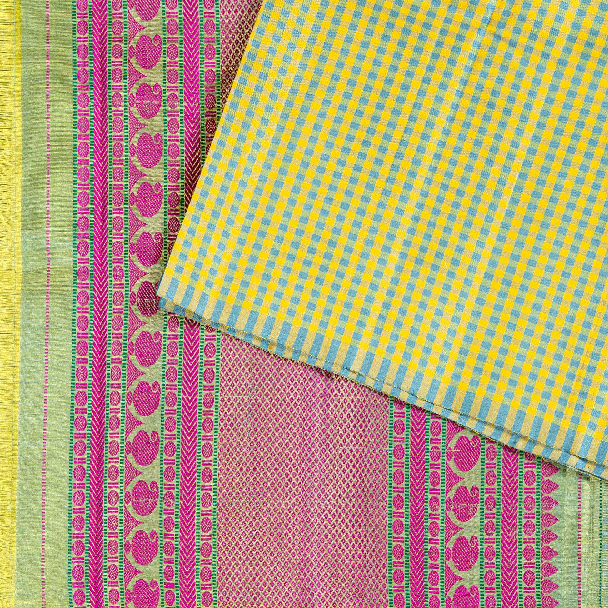 A unique and vibrant handloom silk saree with a playful, contemporary design. The main body features a lively yellow and light blue gingham check pattern. This contrasts beautifully with the rich rani pink and parrot green pallu (end piece), which showcases large traditional paisley/mango motifs woven into the silk. The pallu has a fine pink diamond-weave pattern in the center, framed by vertical stripes. This saree is a bright, bold choice for summer festivities, daytime events, or cultural gatherings.